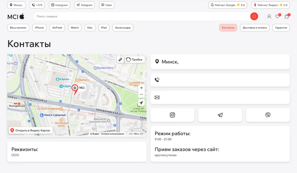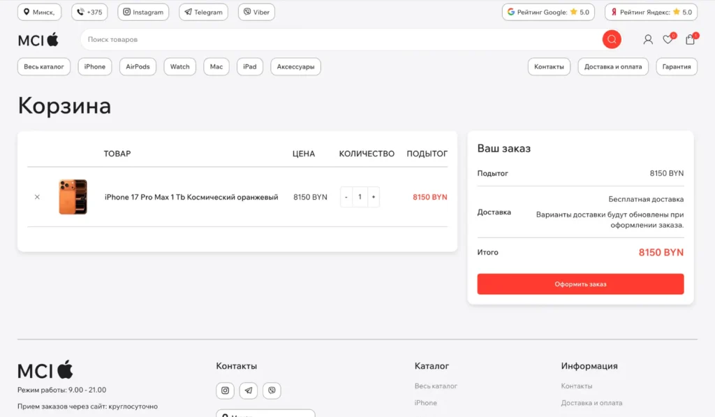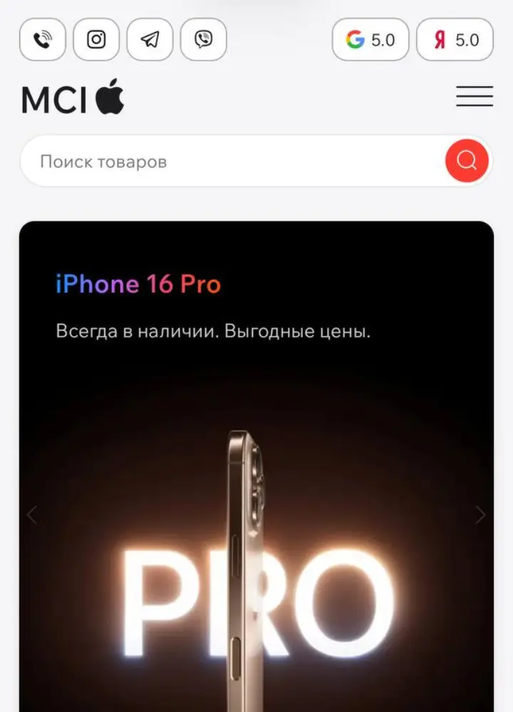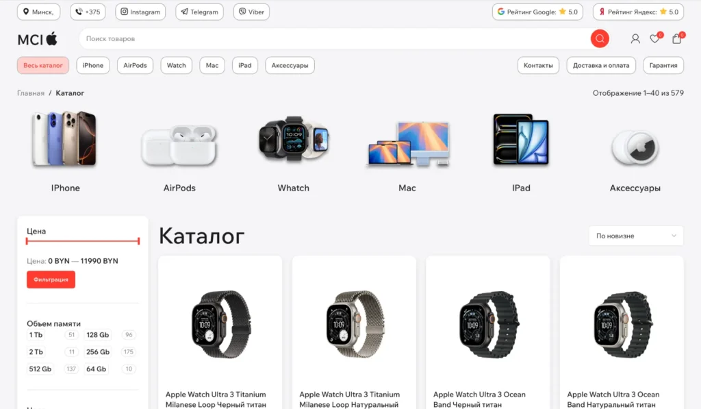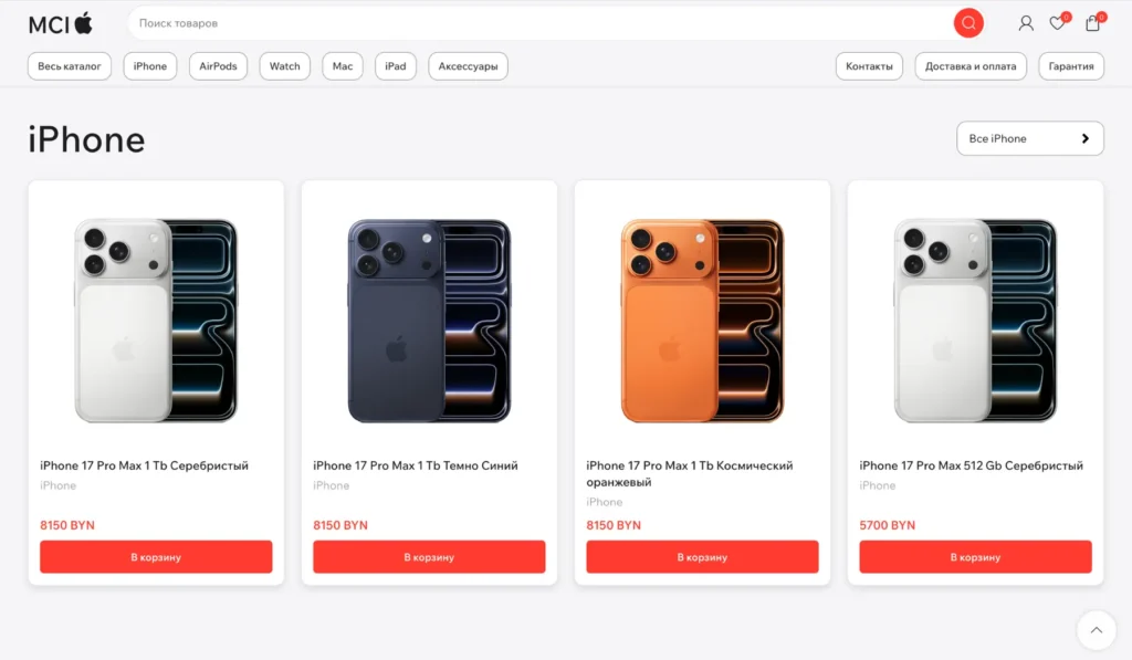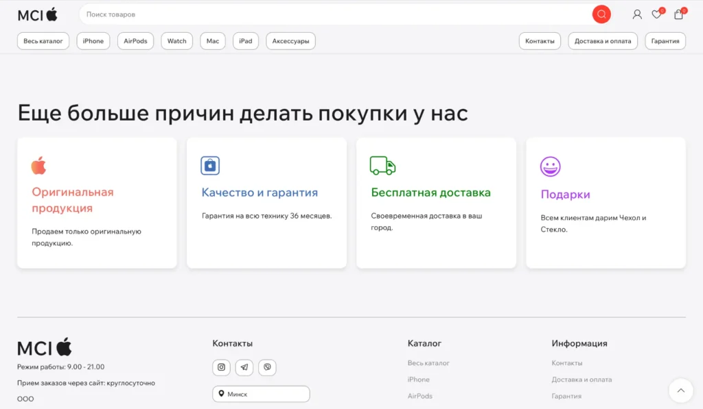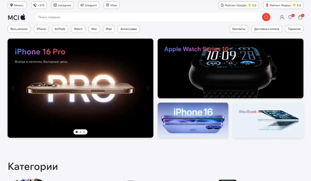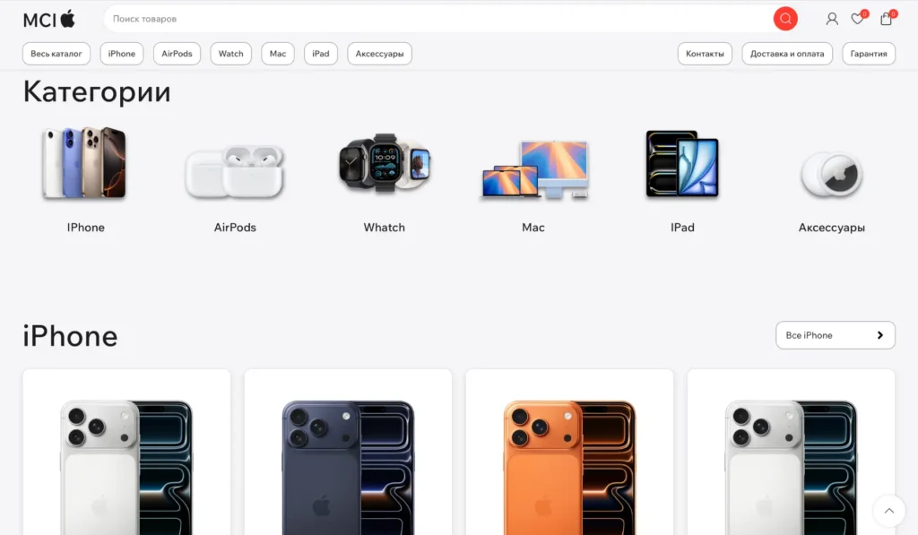 Разработан интернет-магазин по продаже техники Apple для бренда MCI, с акцентом на удобство, понятную структуру и визуальную аккуратность.