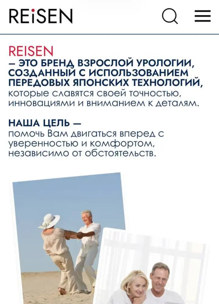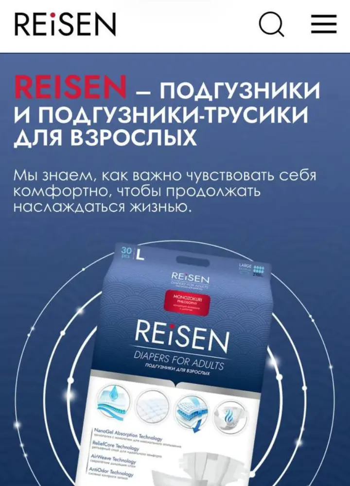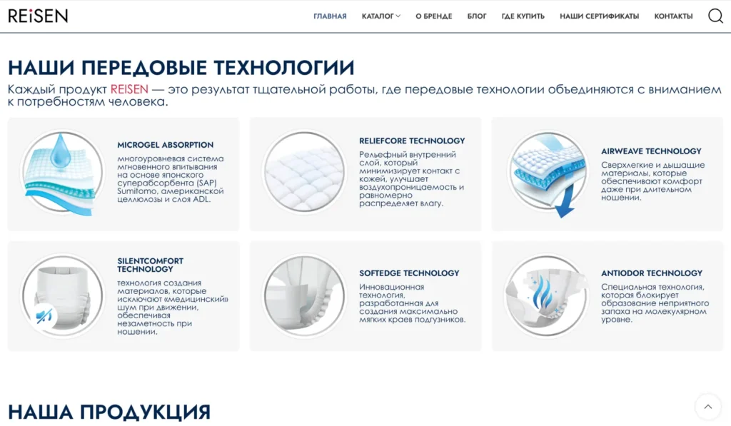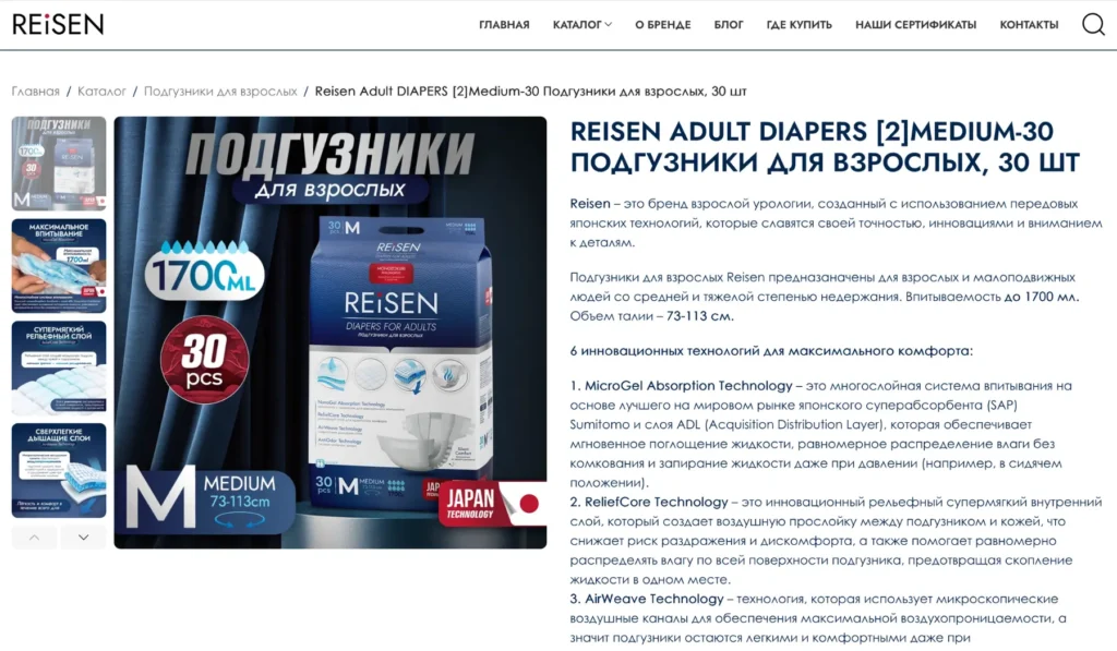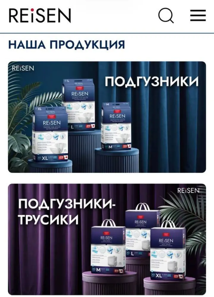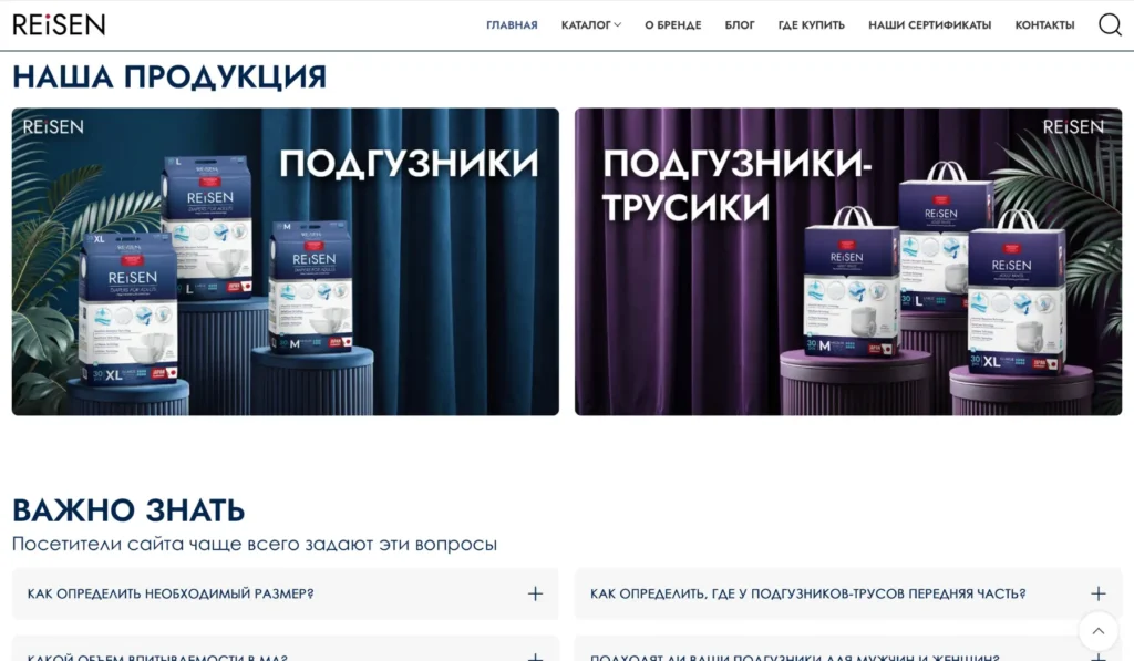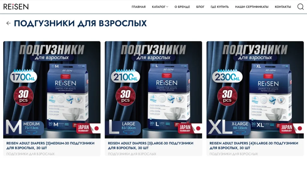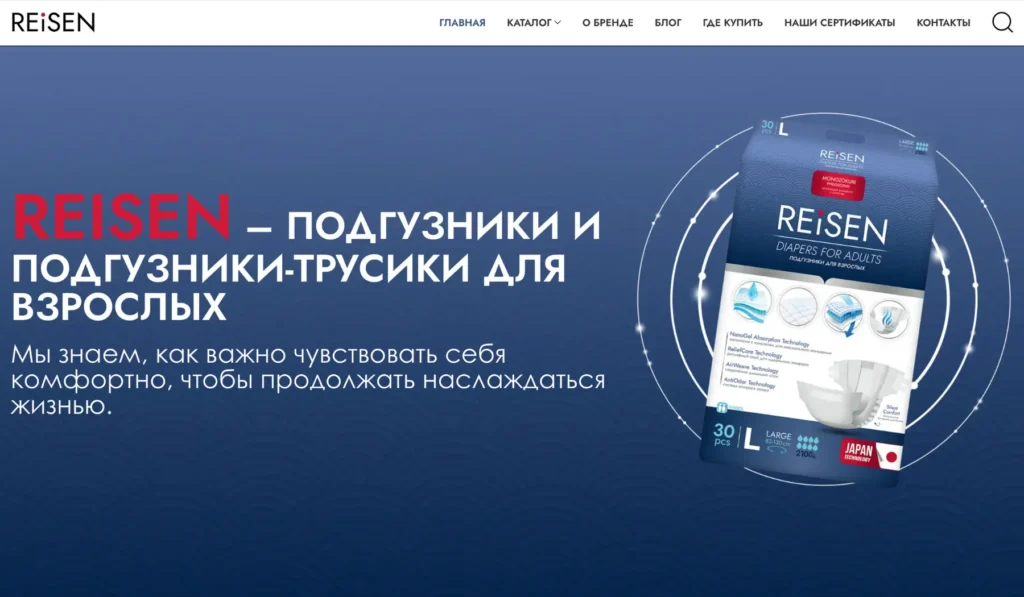 Разработан интернет-магазин в формате каталога для производителя подгузников для взрослых Reisen. Основной акцент был сделан на сохранение фирменного стиля бренда и упрощение пути пользователя к покупке через маркетплейсы.