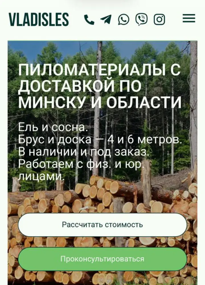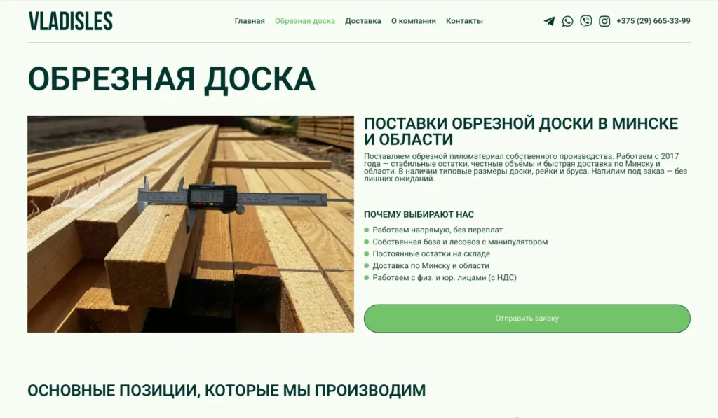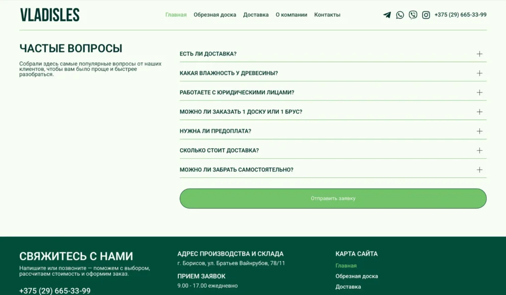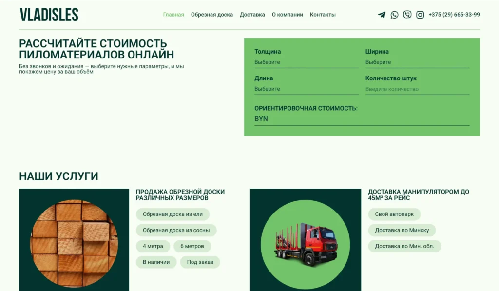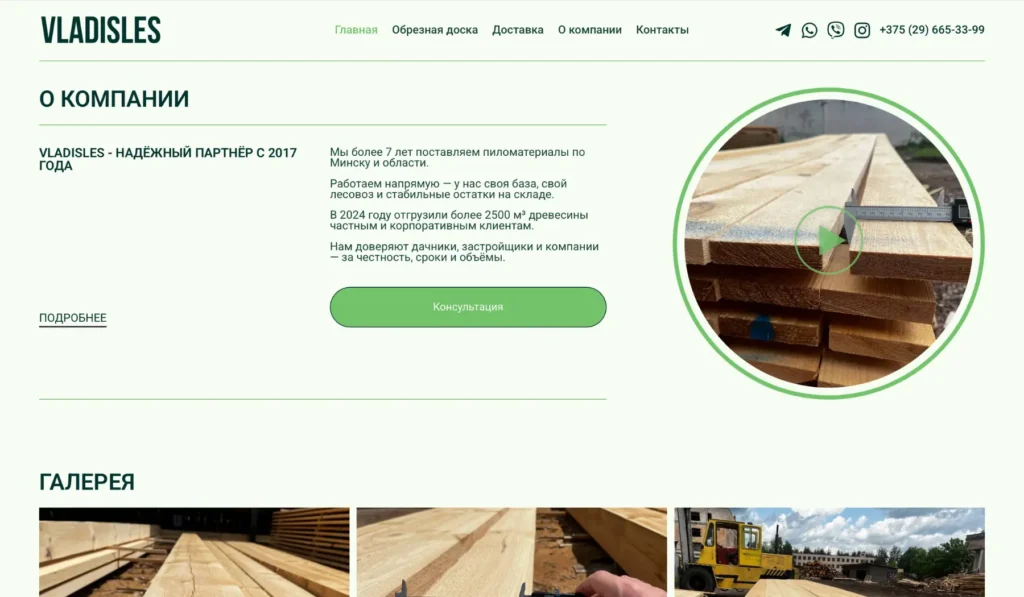 Разработан многостраничный сайт для компании Vladisles, специализирующейся на продаже пиломатериалов. Основной задачей проекта было наглядно рассказать об услугах и упростить взаимодействие пользователя с сайтом. Учтены пожелания заказчика и потребности пользователей: